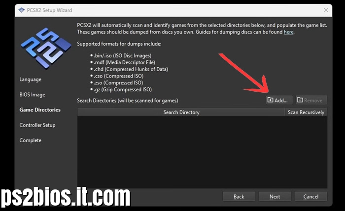 Now, choose the folder where your PS2 game ROMs are stored on your PC. Click Add, navigate to your game files, and select the one you want to play.